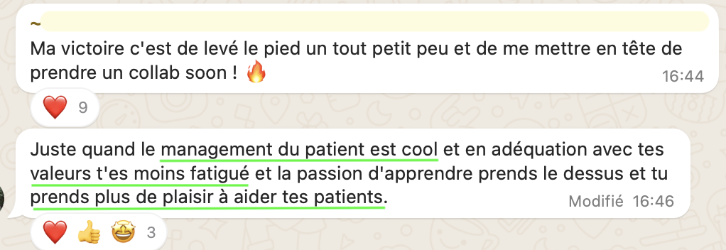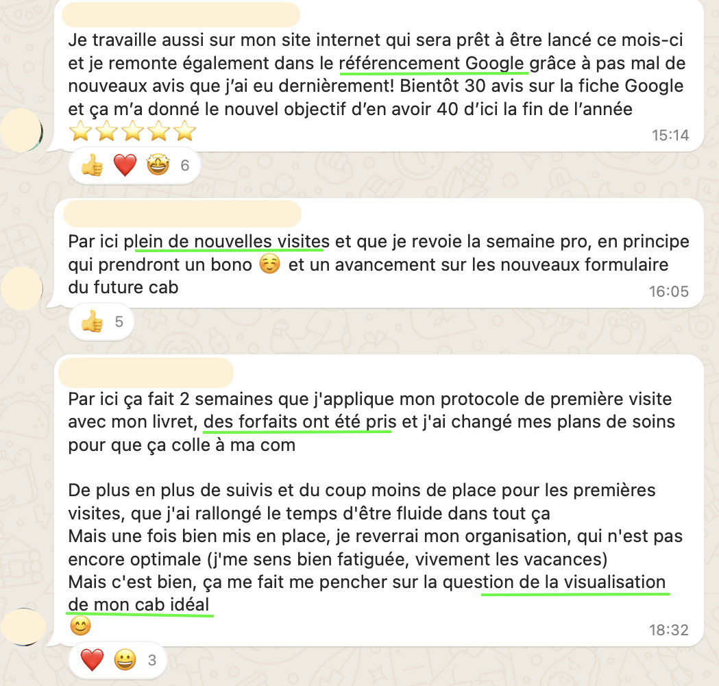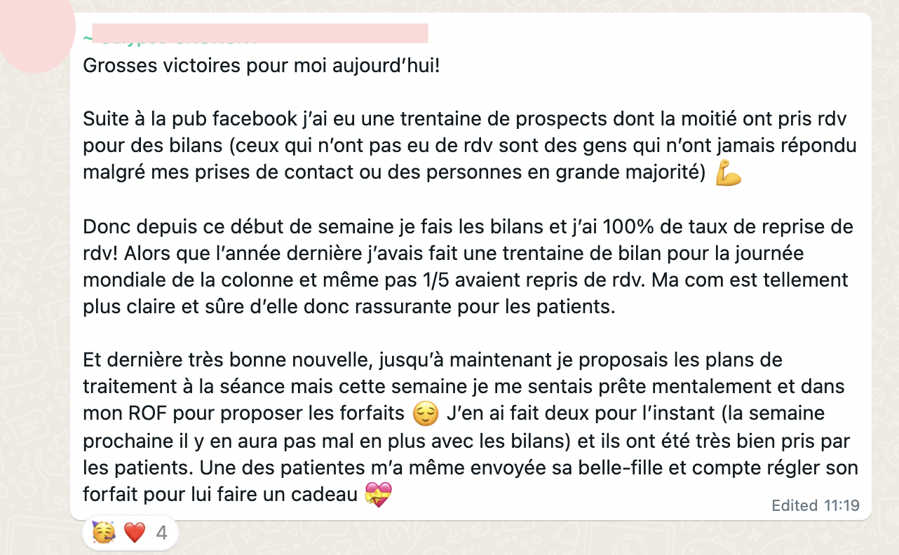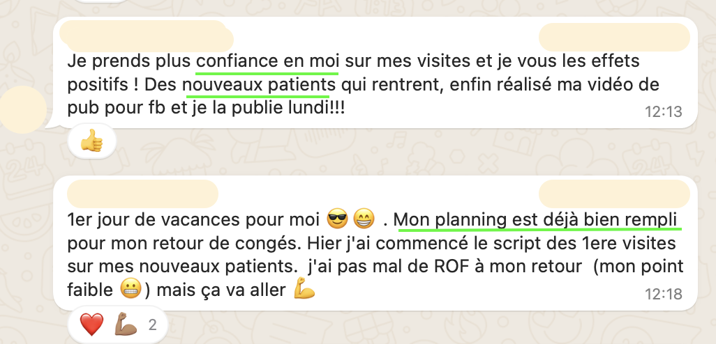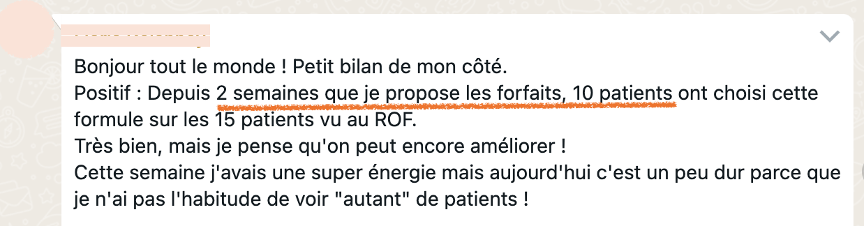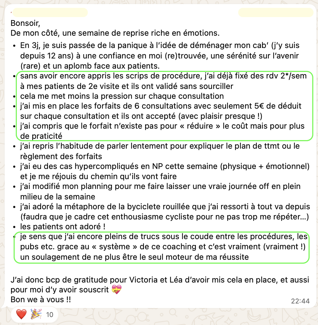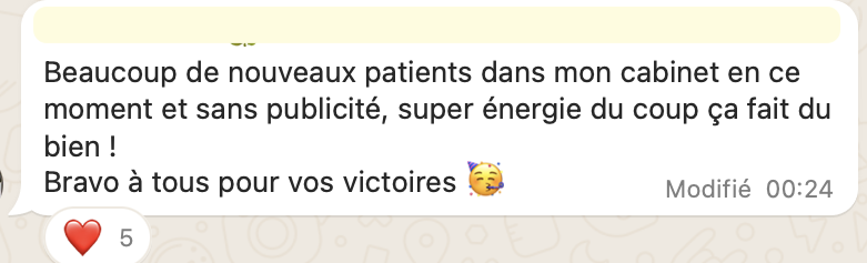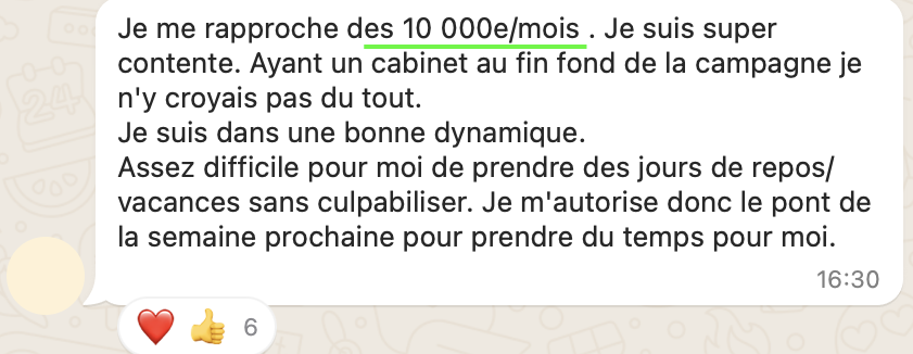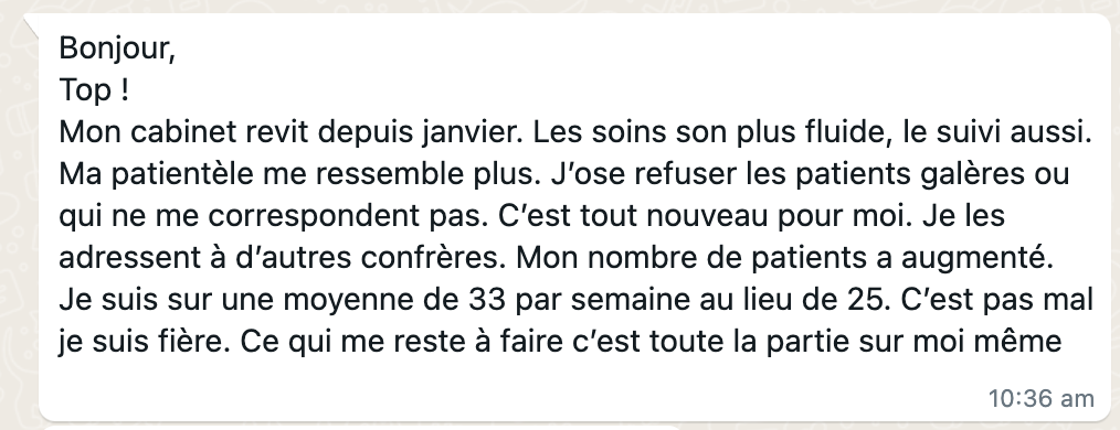 après 2 ans en cab, elle stagne à 20-25 patients/semaine, perdue, pas savoir par où commencer pour changer, elle ne voulait pas de coaching trop commercial