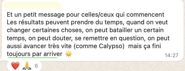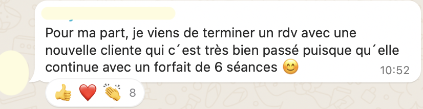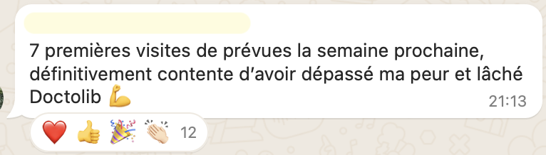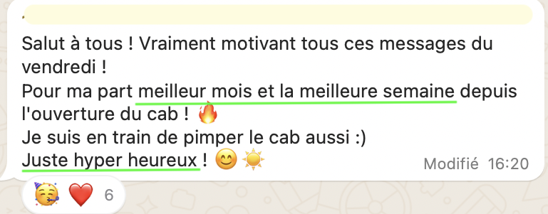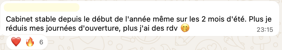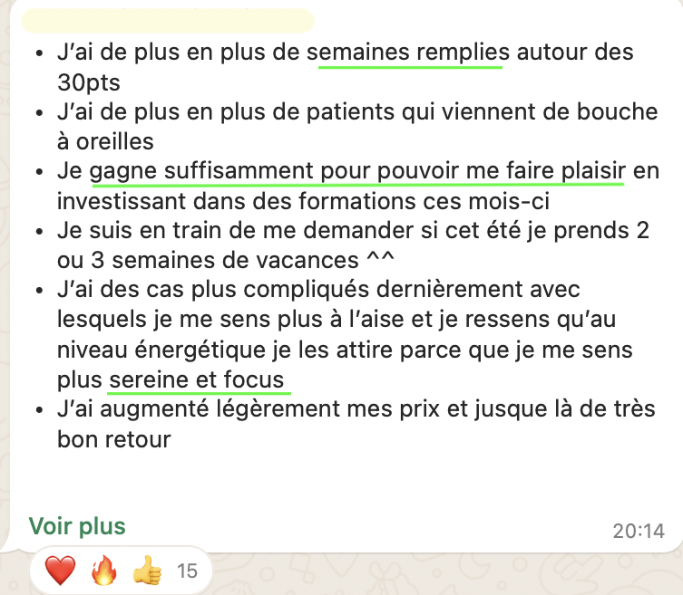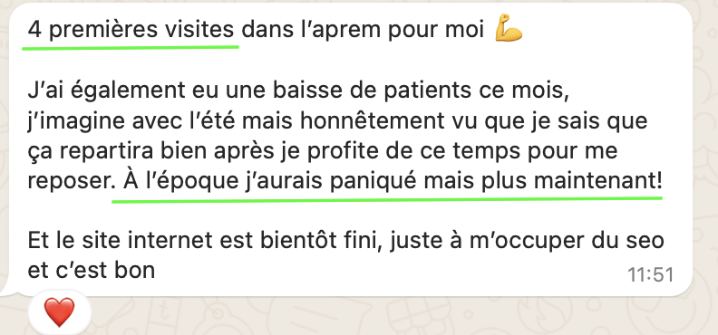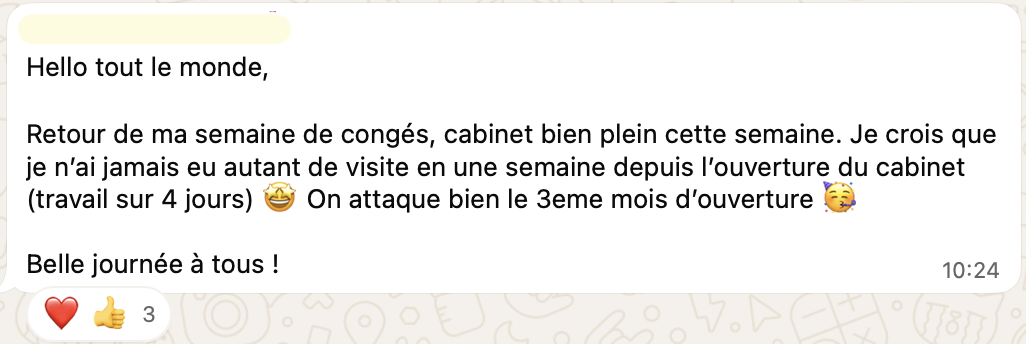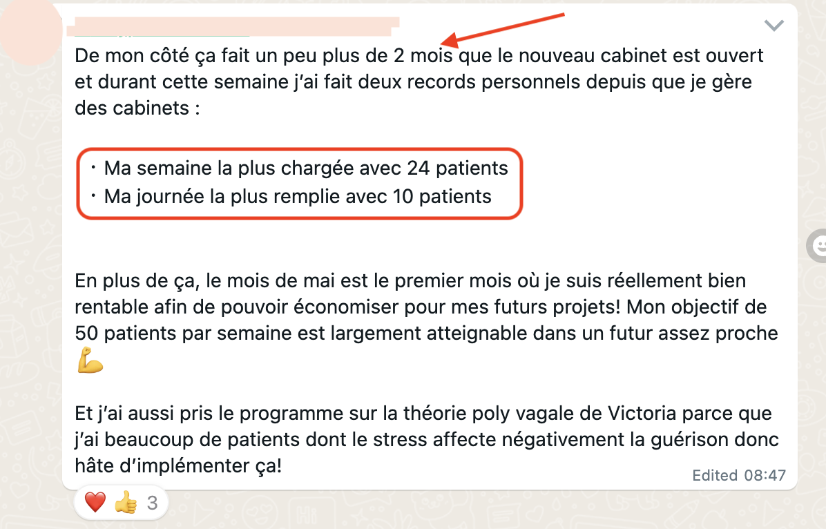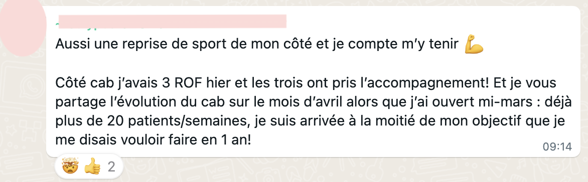 20 RDV par semaine en 20h de travail, elle suit sereinement ses études en parallèle, elle attire des patients très qualifiés avec qui elle aime travailler, elle n'a plus la boule au ventre et s'éclate dans son cabinet